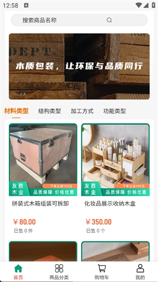 友胜木业是一款专门面向木质包装行业用户打造的购物软件。它拥有丰富多元的商品资源,借助清晰详尽的商品分类,助力用户迅速找到心仪商品并实现在线购买。无论是从功能类型、加工方式,还是结构类型、材料类型等方面,该软件都能为用户提供全面且精准的商品选项,保障采购流程高效又便捷。在此推荐有相关需求的用户使用。
