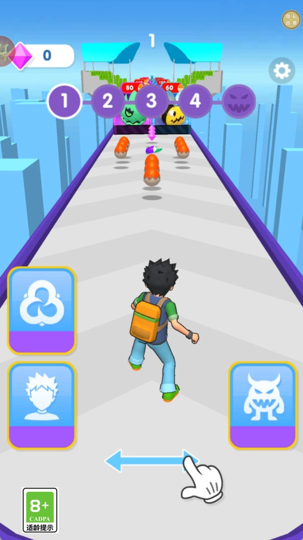 1、滑动屏幕左右移动,上滑跳跃、下滑滑铲,避开障碍物和对手;