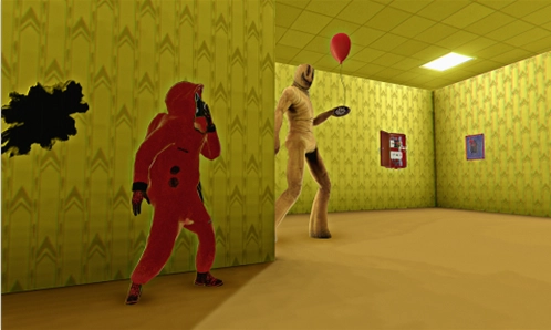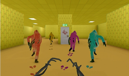 1、遇彩色怪物,别乱跑,看脚印颜色,红、黄、紫、绿对应不同移动区,踩同色脚印,怪物难发现,遇到“EXIT”门,等安全再靠近。