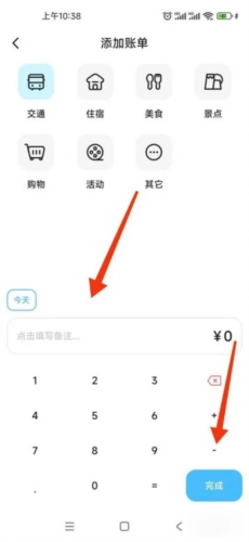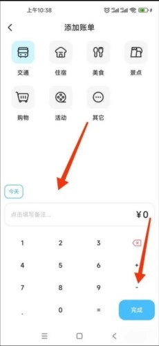 4、进入添加账单界面,选择【账单类型】,输入【金额】,点击【完成】