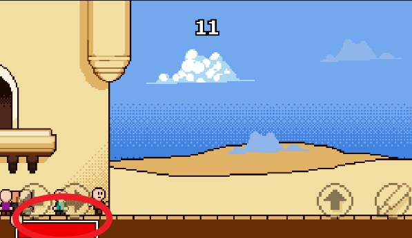 5、右边向上的箭头控制跳跃,棒子图标点击后可以挥动棍棒打飞苹果。