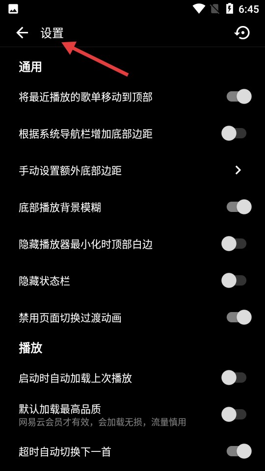 3、设置页面以设置为标题,设有通用、播放等分类,能对歌单位置、播放品质等进行个性化设置。