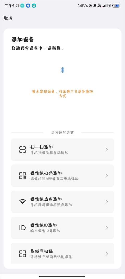 用户如果蓝牙连接失败,可以尝试下方的其他连接,可以使用扫一扫添加、摄像机扫描二维码添加、摄像机热点添加、输入摄像机ID添加、局域网扫描五个手动添加方式进行连接。