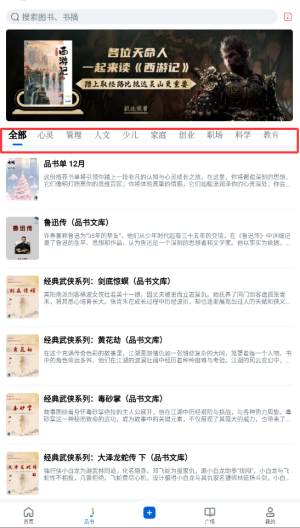 1、启动唯围品书后,在首页导航栏选择"品书"栏目,这里展示各类优质图书资源。
