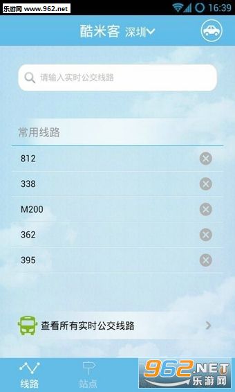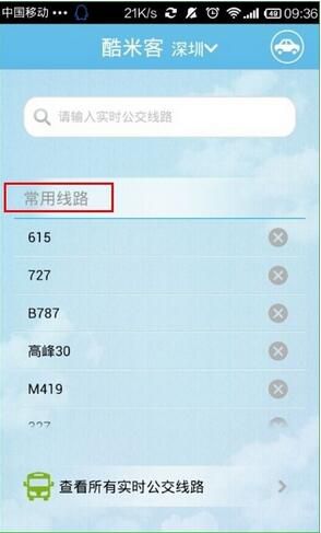 打开“酷米客公交”界面后,能看到系统展示的常用公交线路列表。这些线路通常是用户之前搜索过的,系统会自动将其保存并显示在该区域。