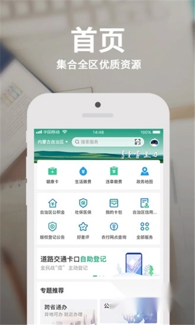 【首页】整合使用频率高且个人关注度较高的便民服务功能,同时增添专题推荐与猜你想办模块。