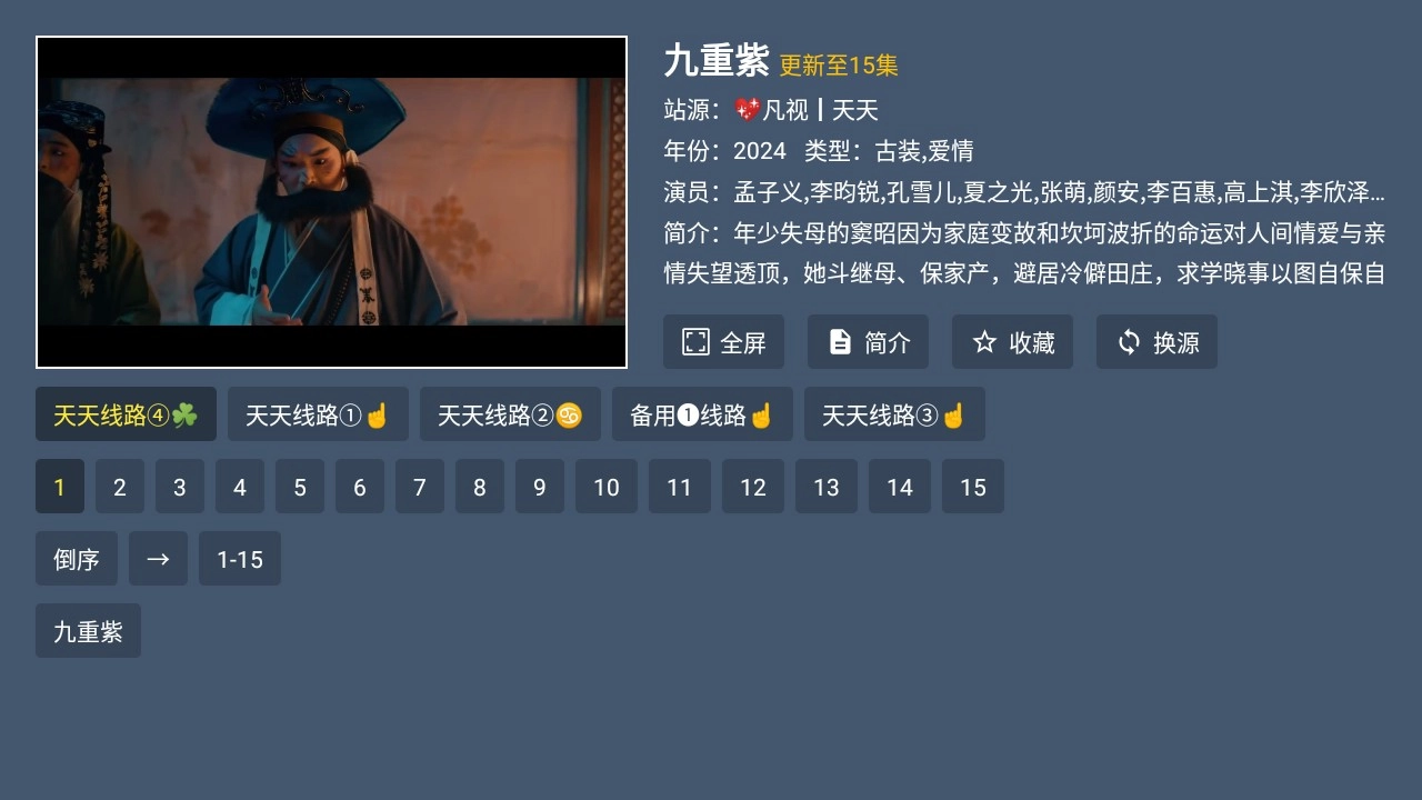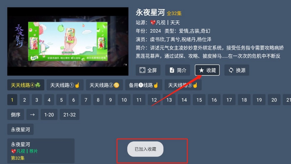 4、选择好想看的影片之后点开,就可以直接观看了,可以选择集数、换源以及收藏。