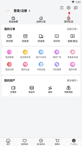 1、找到并点击唯品会软件中的【设置】图标,从而打开个人中心页面,随后再次点击该【设置】图标。