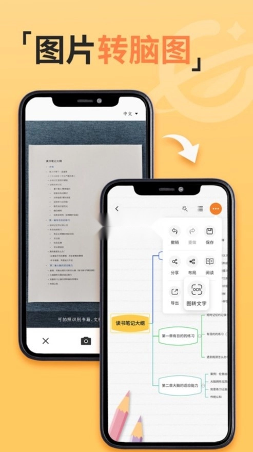 OCR识别选中主题后,选择「 图转文字 」,使用OCR识别功能。你可以拍照或上传本地图片,选择需要识别的语言,稍等片刻即可复制文字或直接保存到脑图。如果需要更改文字,可以直接在识别后的窗口点击编辑修改。