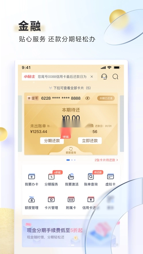 邮储信用卡最新版本的手机版,是中国邮政储蓄银行重点打造的掌上金融理财服务平台。在这里,让数据代替用户奔波,用户足不出户,就能快速完成账单查询、自动还款、卡号激活、挂失补办、转账还款等操作。并且,还能第一时间获取周边各类信用卡的优惠活动信息。