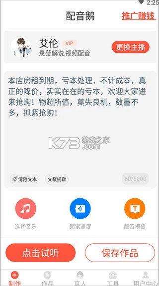 1、配音鹅后,轻松进入制作界面在白板上输入您想要转换的文字,然后点击试听,即可将文字迅速转换为生动的语音