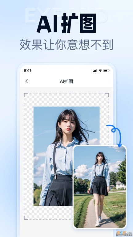 AI扩图的核心作用是拯救那些原本可能被舍弃的照片!无论是年代久远的老照片、需要调整的证件照,还是记录旅行瞬间的旅游照片,它都能帮助恢复原本的模样,让画面变得更精致好看。抠图改图王(Android版)是一款专注于抠图与修图的美化工具,了丰富多样的修图功能和海量美化特效,整体操作起来非常便捷。其中的“AI扩图”功能尤为实用,通过调整画面的扩大比例,就能轻松达成理想的AI扩图效果。
