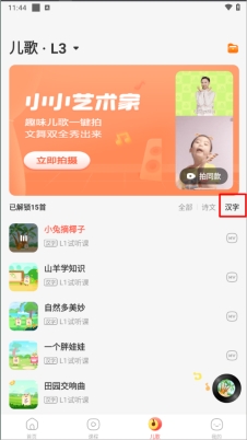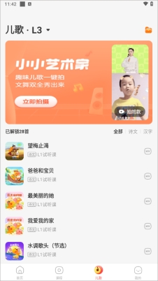 1、进入后,点击儿歌,随机学一首诗文,如望梅止渴