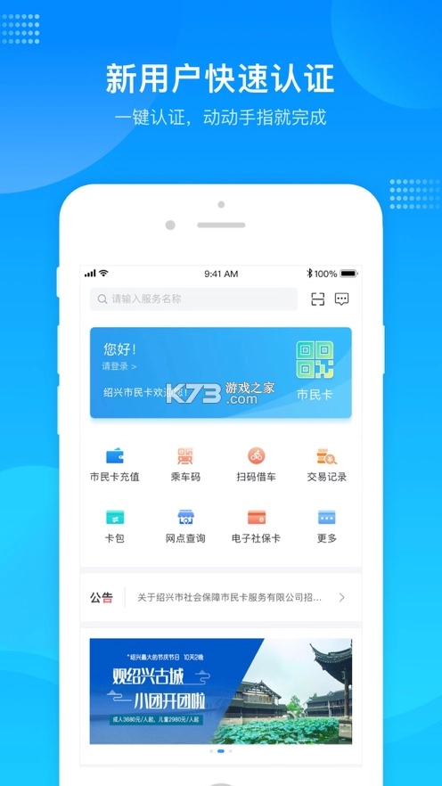 专为绍兴同城服务打造的软件平台,在这里你可以轻松认证,为您的市民卡进行,还可以查询附近网点,为您的生活提供便利