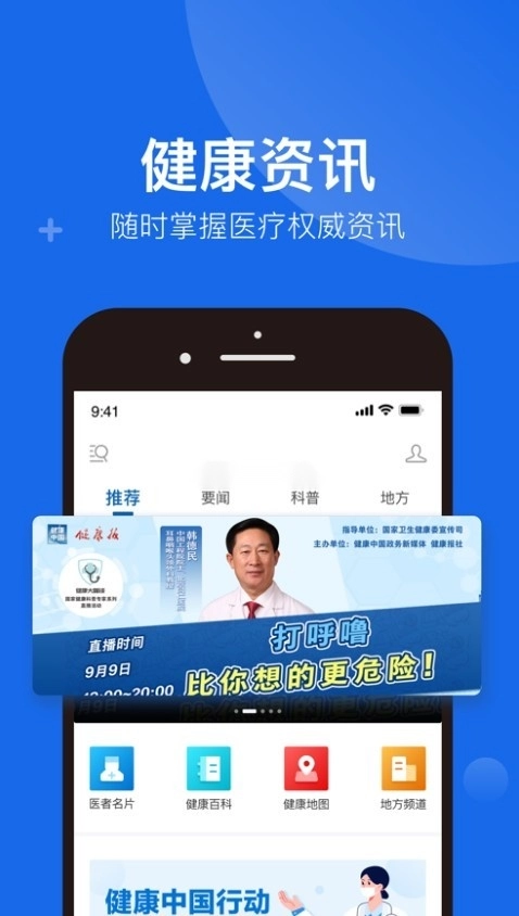 提供权威的健康科普信息、疾病防控知识、健康资讯与健康服务。基于大数据、人工智能和互联网技术,打造健康新媒体传播与服务的客户端。普及健康知识、提升健康素养、促进全民健康 。
