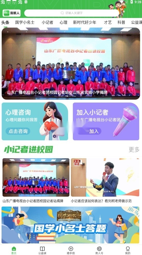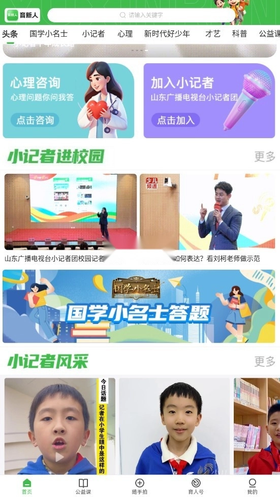 “育新人”开设心理健康、传统文化、国学小名士、新时代好少年、才艺展示、科普、小记者、公益课堂、育人号等版块。根据青少年特点,着力打造家庭、学校、社会、媒体联合的思政育人体系、教育普及体系、文化传播体系等,探索文化数字化、媒体数字化、育人数字化结合的山东实践。