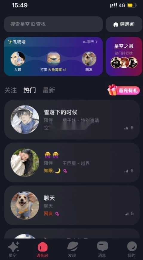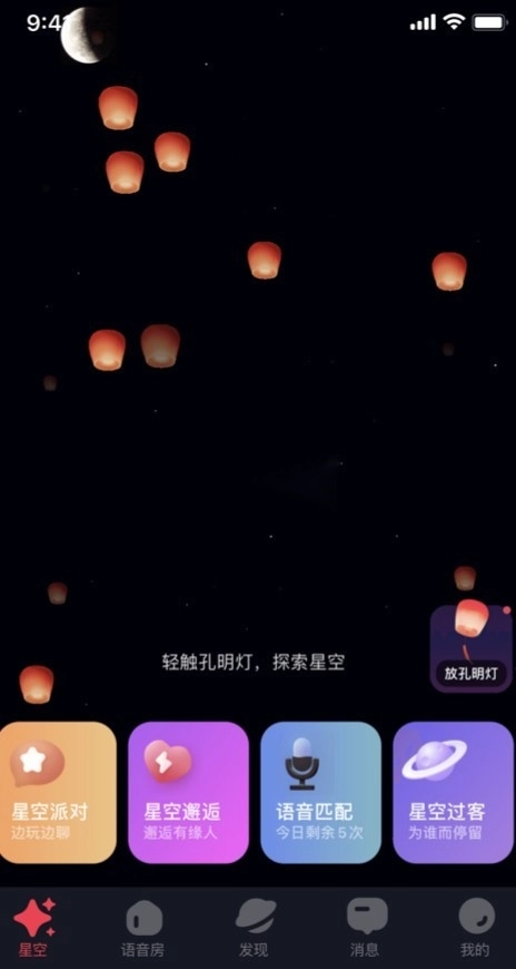 可以通过星空邂逅、孔明灯、语音连线等方式,快速找到一个真实用户,开启一段畅快的聊天对话。