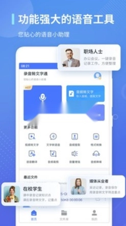 适用人群:1.职场人士:办公会议,一键录音,轻松记录办公内容,整理所需文件。2.在校学生:课中用录音记录知识点,保存下来;课后录音转文字,将知识点转为文字,快捷高效的记录重要的知识点。3.新闻记者:采访记录,录音保存;用录音转文字将重要事件,快速筛选出来。