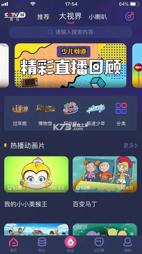 央视少儿作为国内当下极具热度的少儿电视频道之一,像金鹰卡通等电视频道同样适宜少儿观看。央视少儿是由央视少儿频道精心打造,即广为人知的CCTV14频道。家长们能够借助手机,让孩子收看到精彩纷呈的少儿节目。