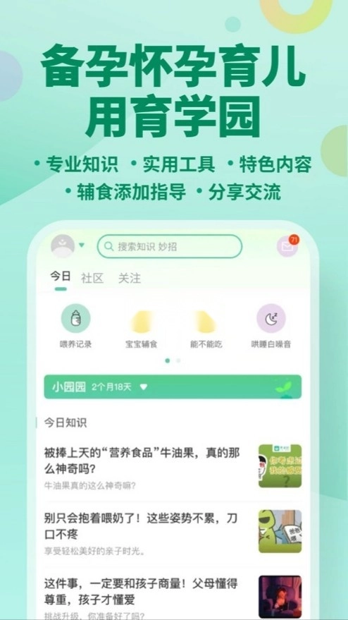 育学园五年来在专业领域深耕,为家长提供专业的孕期护理、饮食、胎儿发育、健康和宝宝发育、喂养、辅食、护理等方面知识指导,根据妈妈孕周及宝宝年龄,定制化每日知识。