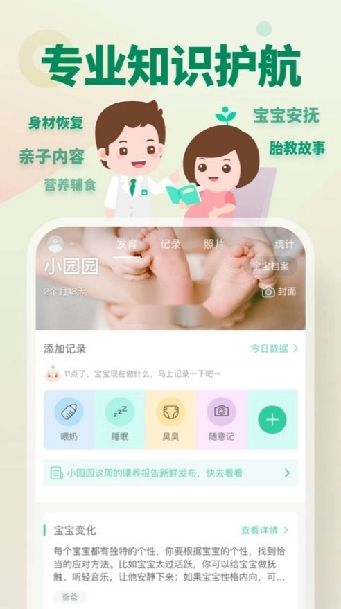 自动绘制清晰的曲线图表,展示孕期变化,宝宝吃睡便规律,生长发育情况,为宝宝树立健康好习惯。