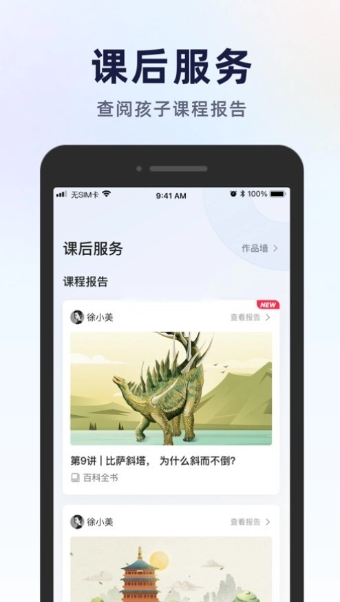 【课后服务】家长与学生可以查看兴趣课程报告,将孩子的成果拍摄上传,并在作品墙与查看其他孩子的作品,互相点赞