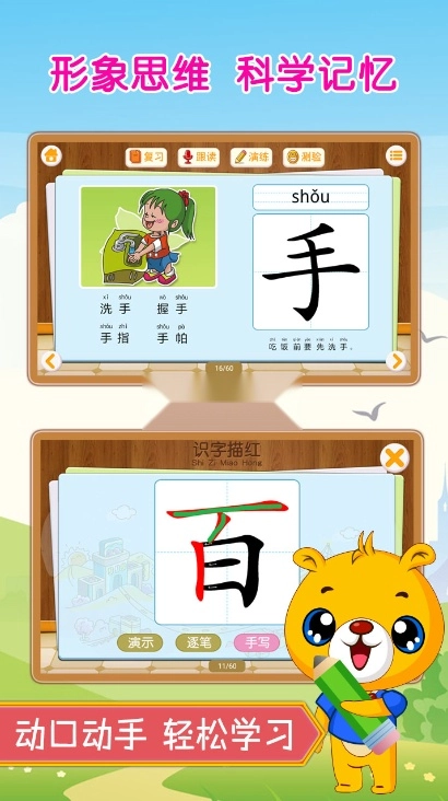 形象的场景例句配图:巴比学汉字提供形象的场景例句配图,帮助宝宝理解和记忆汉字的意义和用法,增加学习的趣味性和可行性。