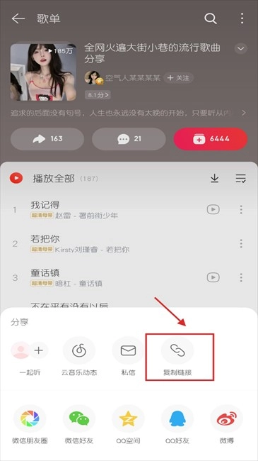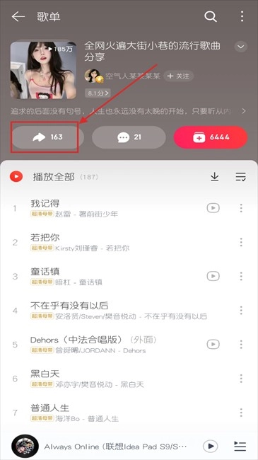 1. 首先,打开网易云歌单的详情页面,从中挑选出你想要导入的歌单,接着点击分享按钮。
