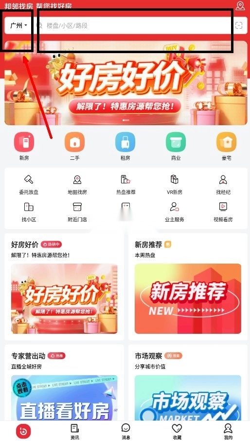 5.登录后点击软件首页上方选择你想要找房的城市,然后输入楼盘即可。