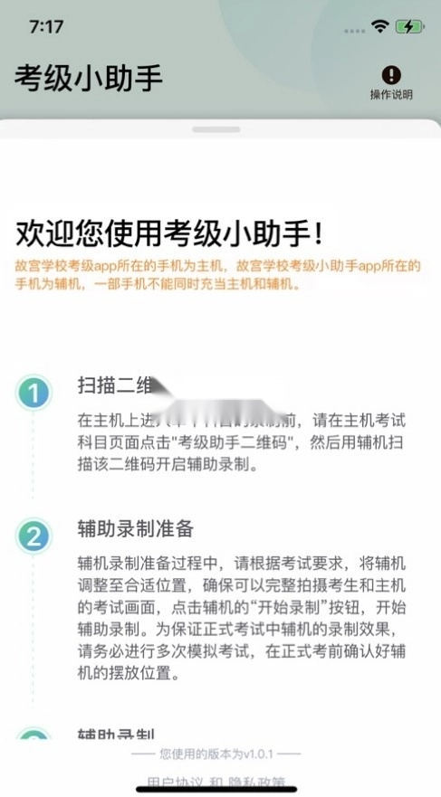 考级小助手主要用于辅助在线视频考级的双机位考试监控。考生仅需扫描主机二维码,启动辅机位录制并点击确定,就能开启辅机监控录制。