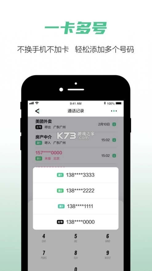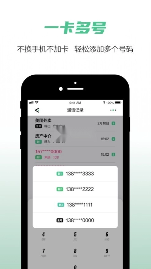 已有多个移动号码,无需携带多部手机或双卡双待机,可在和多号软件中将其中一个号码设置为主号,其它号码设置为副号,最多一卡四待。