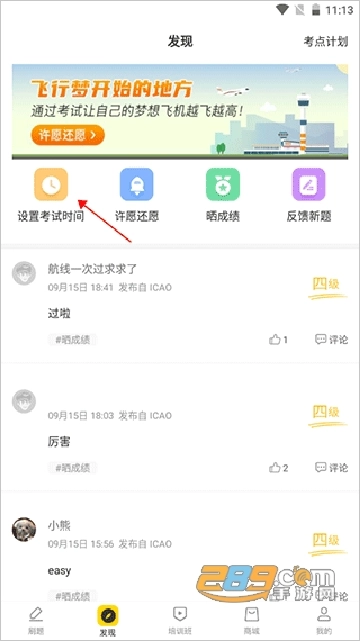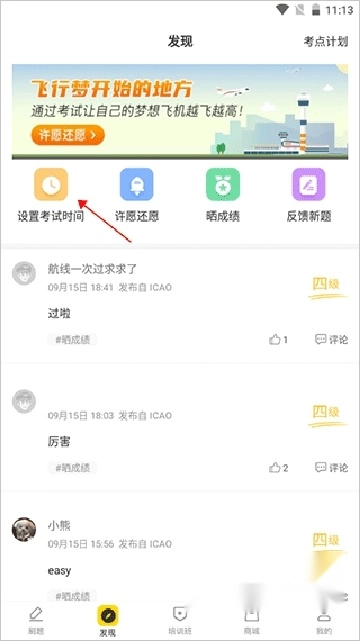 1. 打开软件完成注册登录后,于“发现”界面点击“设置考试时间”。