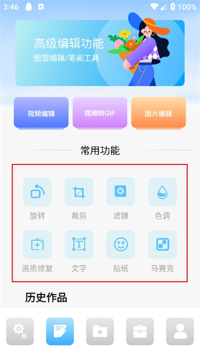 具备将多张图片串联成长图的能力,并图片滤镜、自由涂鸦及丰富贴纸等创意工具。