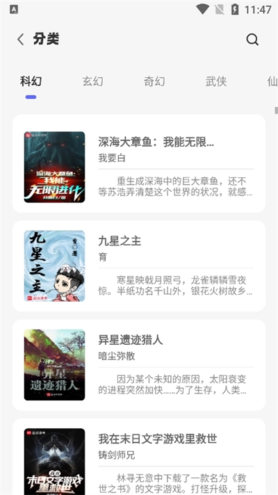 3、步入这个阅读世界,你将开启一段美妙的阅读旅程。无论是悬疑、言情、科幻还是武侠,各类小说应有尽有,任你挑选。