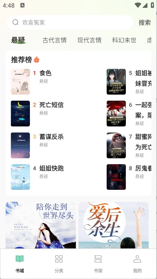 2、进入首页,“书城”以及“分类”页面有很多的小说资源,包含了言情、科幻以及武侠等类型。