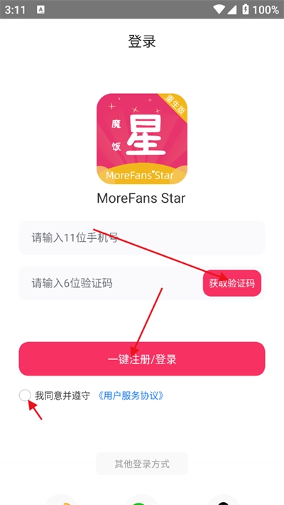 输入手机号获取验证码即可登录