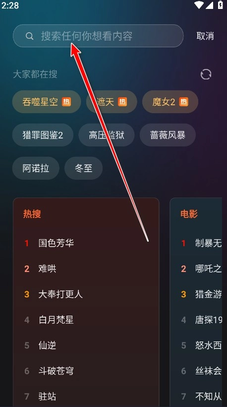 1. 开启电影猎手的最新版本,轻点首页上方的搜索框。