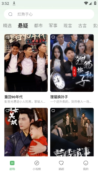 2、首页顶部栏有很多的短剧类型,包括都市、悬疑以及古言等类型。