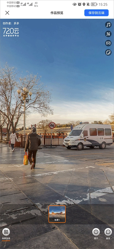 5、最后就可以预览制作完成后的全景图作品啦,然后点击保存到云端后就制作完成啦