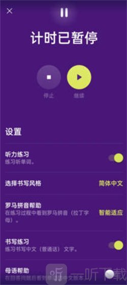 6、点击暂停,我们还可以设置听力练习、书写练习等功能。