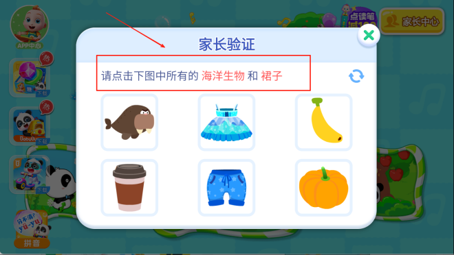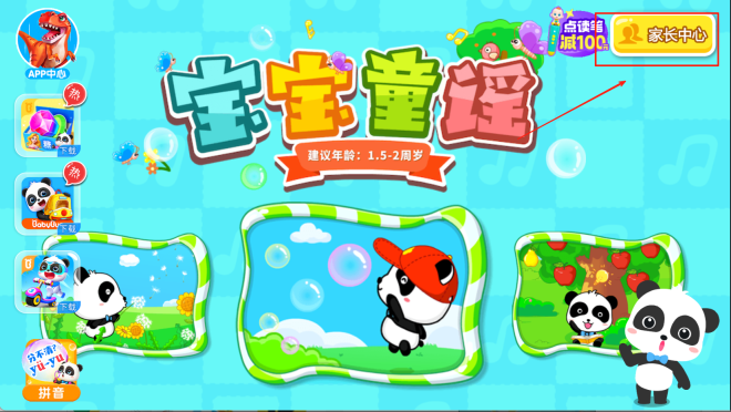 1、我们先进入到宝宝童谣里面,能够看见右上角有个家长中心,我们点击这个功能。
