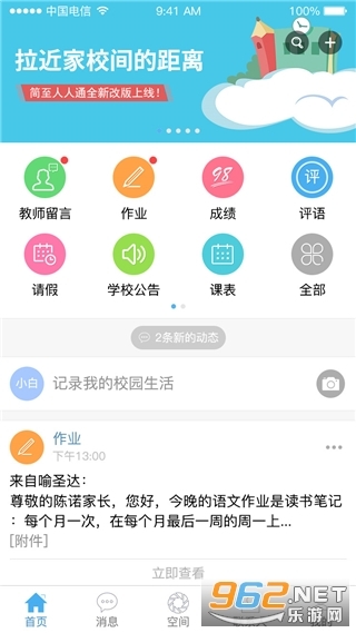 进入,这样就能查看收到的各类消息,知晓聊天沟通以及作业相关的具体内容了。3、在动态页面,可以查看最新的动态信息,可以查看自己的动态内容。