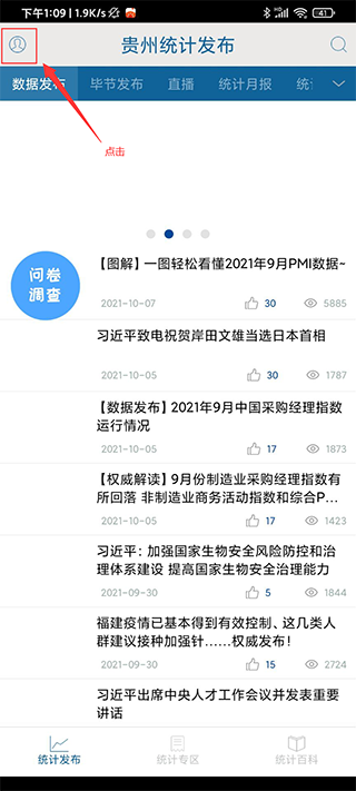 1首先启动“贵州统计发布”应用,接着找到界面左上角的菜单图标并点击,以此展开侧边滑动菜单。