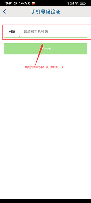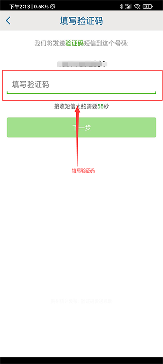 4在指定位置填写个人手机号码,随后点击界面上的“下一步”按钮,系统将跳转至短信验证码的验证页面。
