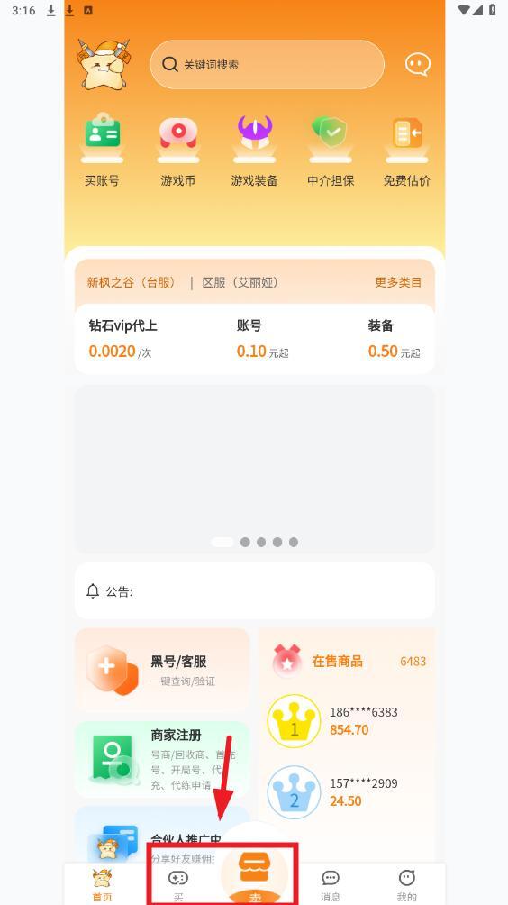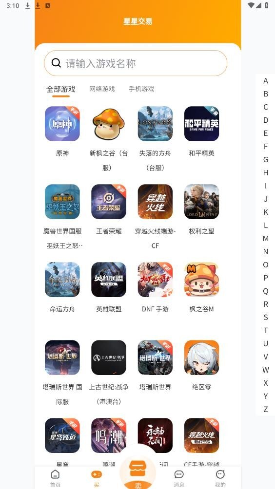 1、打开星星游戏交易平台,点击搜索栏或者挑选想要进行交易的类型