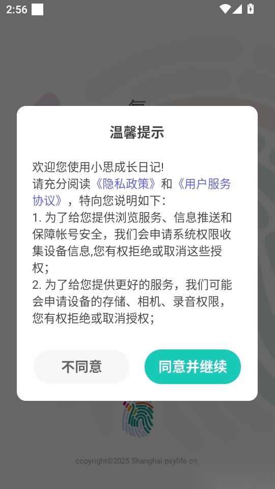 1.首先打开软件阅读完“温馨提示”后,点击“同意并继续”按钮进入