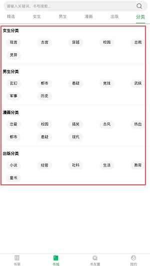 3、点开书城,有精选、女生、男生、漫画、出版等;