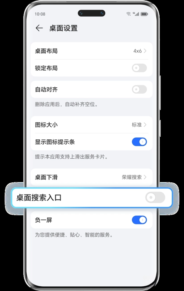 在设置>桌面和个性化>桌面设置>桌面搜索入口中关闭开关后,手机桌面就不会再显示荣耀搜索入口了。