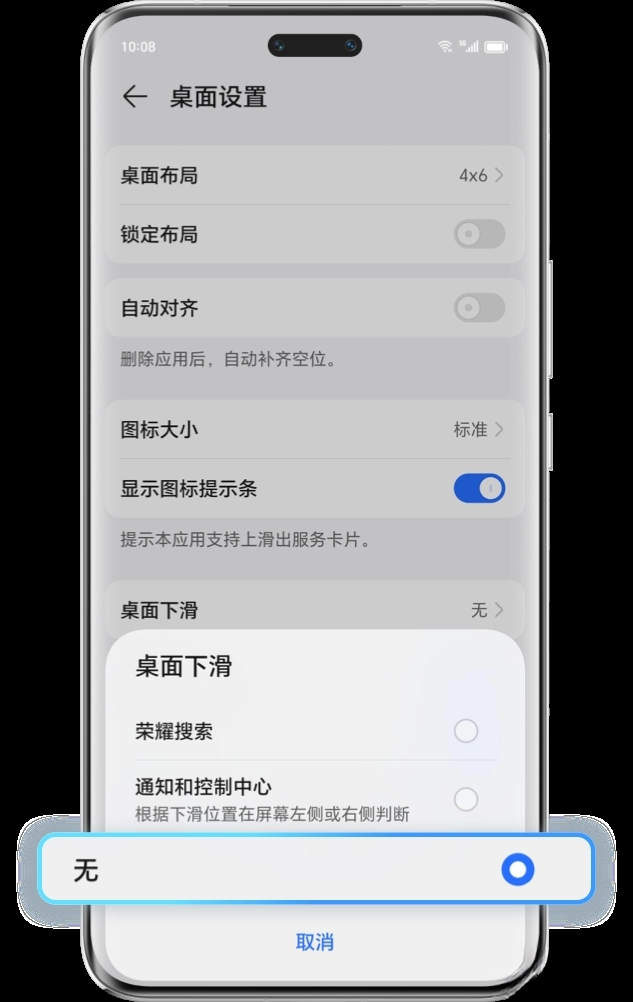 同样进入设置>桌面和个性化>桌面设置页面,点击桌面下滑选择无或通知和控制中心后,再次下拉桌面将不会进入搜索页面。