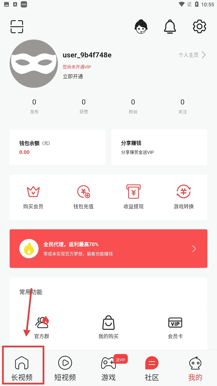 1、在【我的】页面,点击底部【长视频】选项,即可进入长视频页面,浏览相关视频内容。